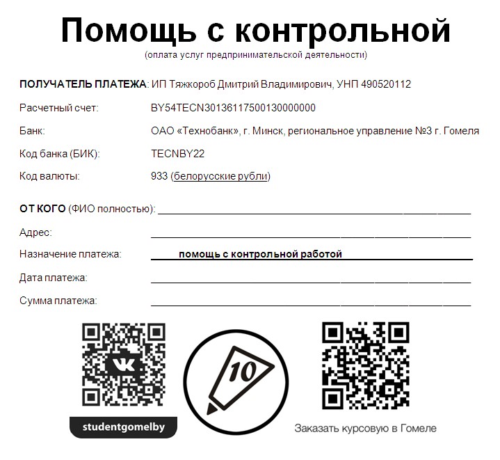 - Получатель платежа: ИП Тяжкороб Дмитрий Владимирович, УНП 490520112